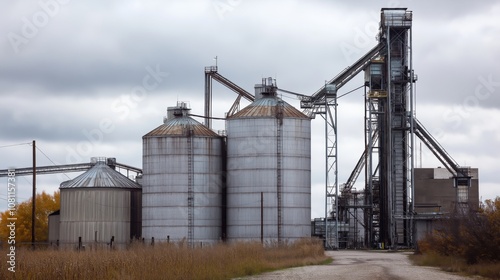 Rural industrial grain silos and storage facility with overcast sky and autumn foliage surroundings
