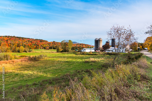 Rural landscape in Vermont with farm buildings along an unpaved road on a sunny autumn day. Stunning fall foliage.