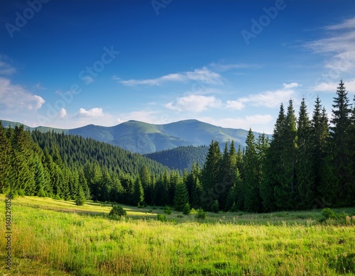 rural landscape of ukraine in summer for travel coniferous forest countryside scenery with green field and trees on the hill beautiful view of borzhava mountain ridge in the distance