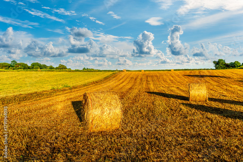 rural summer landscape of green field with golden wheaten hay stacks among farmland fields in a beautiful valley lowland