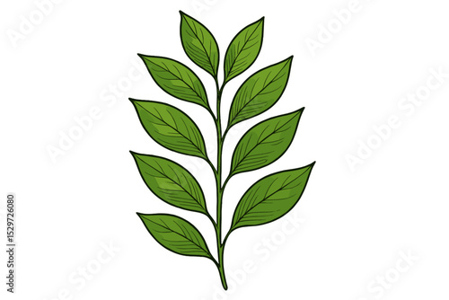 Ruscus leaf branch vector illustration. Green foliage isolated on white background. Botanical drawing of a plant stem with leaves. Hand drawn floral sketch for decorative design.