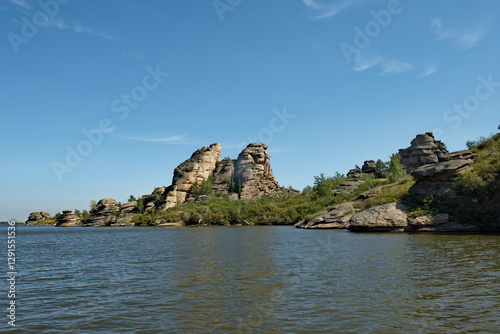 Russia. Altai Territory. Picturesque shores of Lake Kolyvan is surrounded by bizarre rocky outcrops located near the border with Kazakhstan.