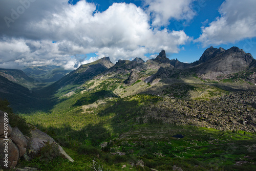 Russia. Krasnoyarsk Territory, Eastern Sayans. The view from the Taigish Pass to the Valley of Dreams is the main attraction of the Ergaki Natural Mountain Park.