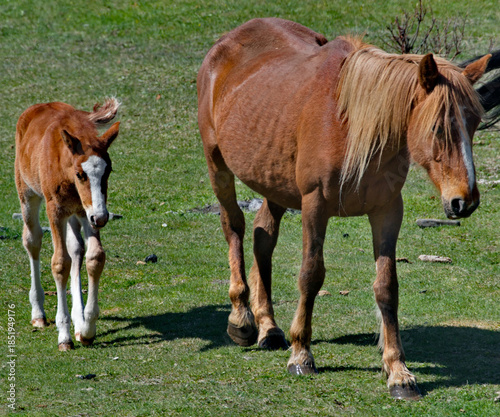Russia. mountain Altai. Peacefully grazing horses with foals in the spring mountain steppes along the Chuisky highway.