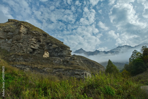 russia, caucasia, mountain, rock, arch, gate, background, pass, passage, morning, autumn, travel, tour tourism, nature, remote, distinctive, district, edge, environment, open, education, geologic, geology, grass, excellent, sand, habitat, harsh