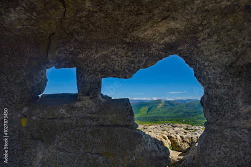 Russia, the Republic of Crimea. A view from inside the dilapidated stone room of the famous cave city of Mangup-Kale of the 5th century in the Bakhchisarai district.