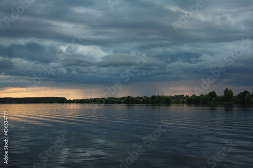 Russian beautiful Volga river landscape with calm water at Summer evening on dark blue cloudy sky background