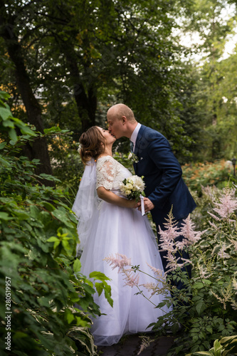 bride, woman, female, girl, beautiful, elegant, dress, white, happy, pretty, bouquet, groom, male, man, man, boy, suit, photogenic, honeymooners, couple, meeting, date, hug, kiss, together, amicable, wedding, marriage, celebration, holiday, cheerful, joyful, joy, happiness, love, walk, park, nature, landscape, city, urban, summer, spring, autumn, bald