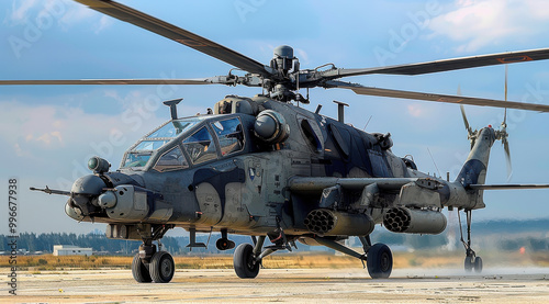 Russian combat helicopter flying against a clear blue sky in high-quality detail