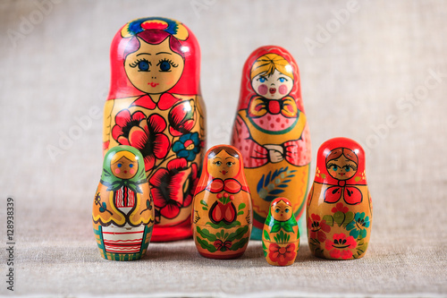 Russian dolls. Matryoshka on linen fabric for the background.