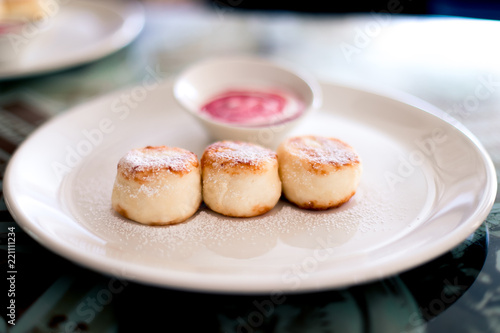 Russian syrniki or sirniki, cottage cheese pancakes
