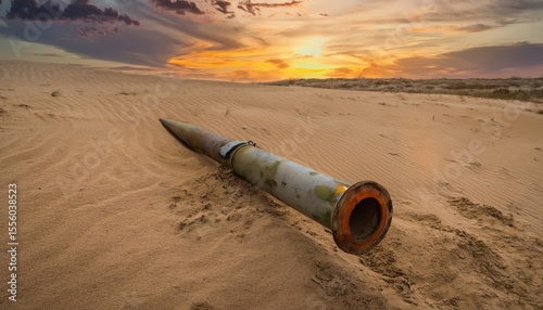 rusted artillery barrel buried in desert sand under vivid sunset sky with scattered grass and dramatic clouds abandoned war relic evoking forgotten conflict in arid battlefield terrain