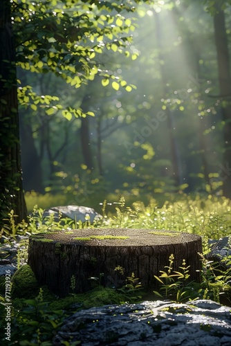 Rustic 3d podium in a sunlit forest clearing, for nature-inspired products