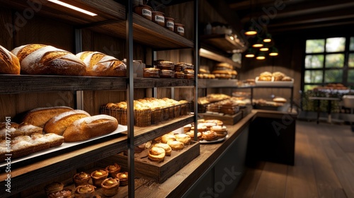 Rustic bakery shelves filled with bread, pastries, and goods; warm interior with garden view