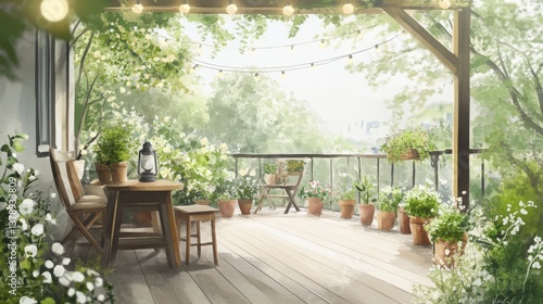 balcony, garden, patio, plant, flower, summer, spring, daylight, morning, calm, peaceful, serene, tranquil, relaxed, wood, table, chair, pot, terracotta, green, white, brown, sunlight, light, string, light, deck, wooden, rustic, cosy, comfortable, landscape, scenery, view, nature, greenery, lush, vibrant, bright, warm, airy, fresh, living, relaxing, get-away, escape, home, decor
