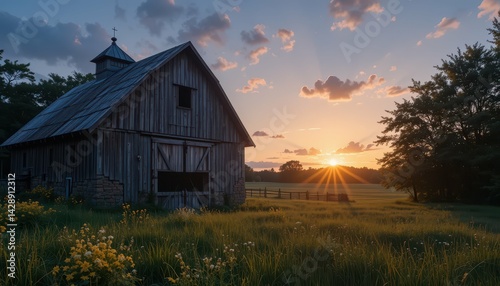 Rustic Barn at Sunset with Golden Light and Vibrant Nature Surroundings