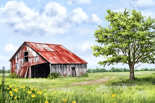 barn, farm, countryside, rural, field, sky, cloud, tree, meadow, landscape, rustic, old, vintage, nature, green, spring, summer, pasture, grass, outdoors, tranquil, serenity, peace, calmness, open, roomy, quiet, alone, calm, simple, simplicity, scenery, image, photo, stock, illustration, digital, art, painting, colours, detail, photo, view, past, pastoral, homestead