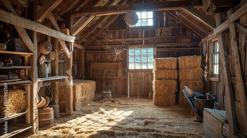 barn, interior, rustic, hay, bale, wooden, beam, shelf, sunlight, warm, cosy, inviting, window, sun, light, wood, natural, old, vintage, farm, country, agriculture, spider's web, tool, barrel, broom, shovel, storage, straw, shed, traditional, classic, countryside, ranch, rural, sunbeam, glow, nostalgic, serene, calm, peaceful, organised, tidy, clean, organic, ambient, timber, framework, architecture
