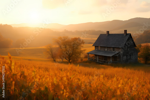 Rustic barn silhouette against golden sunset over autumnal wheat field