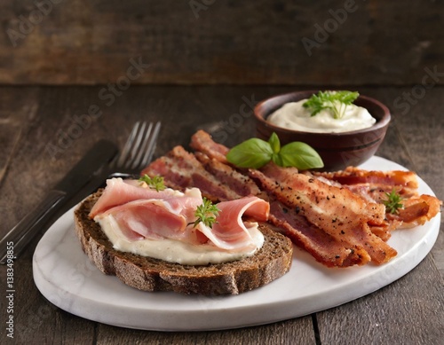 bread, whole grain, loaf, dip, bacon, healthy, food, eating, snack, breakfast, lunch, dinner, meal, epicure, delicious, tasty, fresh, bakery, baked, culinary, cookery, rustic, brown, grain, seed, sesame seeds, herb, plate, wooden, table, closeup, macro, detail, isolated, background, design, element, food photography, culinary arts, gourmet food, healthy snack