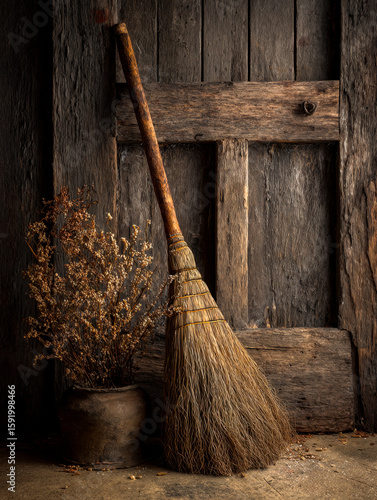 Rustic broom leaning beside dried floral arrangement against weathered wooden backdrop