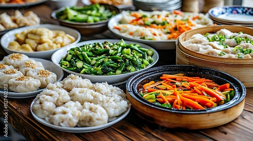 asian cuisine, brunch, buffet, cafes, celebration, rustic, hot, pot, steamed, vegetable, greener, carrot, dumpling, presentation, colours, healthy, dining, food, service, plate, table, culinary, freshness, meal, cookery, eatery, gathering, homemade, organic, enjoyment, favor, delicious, sharing