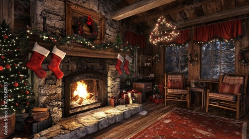Rustic cabin interior featuring a crackling fireplace, festive decor, and Christmas stockings on the mantel.