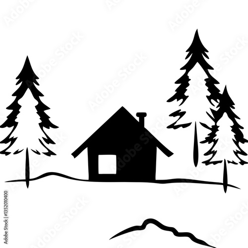 cabin, silhouette, pine tree, forest, nature, illustration, rustic, landscape, graphic, design, wood, simple, minimalistic, black-and-white, home, countryside, peaceful, tranquil, scenery, wilderness, filed, house, camping, retreat, calmness, quiet, relaxation, solitude, winter, background, print, decoration, template, bricolage, project, stencil