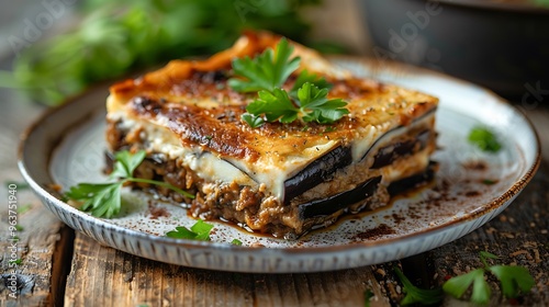 Rustic Ceramic Plate with Classic Moussaka Layers of Eggplant, Meat Sauce, and Béchamel, Garnished with Fresh Parsley Offering a Traditional Mediterranean Dining Experience