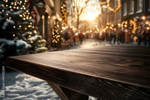 Rustic Dark Wood Table with Background of Blurred Festive Market Lights in Winter Season, Exuding Warmth and Charm Perfect for Holiday Themes