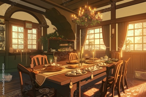 Rustic Dining Room Featuring an Open Layout, a Large Wooden Table, and an Abundance of Natural Light Enhancing the Warm Wood Tones, Cozy Vibe, Generative AI
