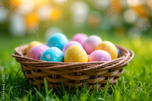 Rustic Easter Basket with Painted Eggs: Vibrant Springtime Setting with Green Grass and Floral Accents