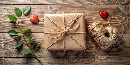gift, present, package, wrapping, twine, heart, love, romance, rustic, wooden, background, texture, craft, hand-made, natural, organic, greenery, sprig, leaf, brown