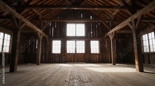 Rustic Interior of an Empty Wooden Barn with Natural Light Streaming Through Windows