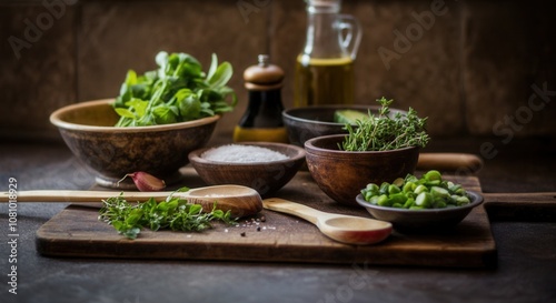 rustic, kitchen, table, fresh, herb, seasoning, basil, thyme, olive oil, salt, pepper, wooden spoon, ceramic, bowl, garlic, food preparation, ingredient, cooking, culinary, aromatic, green, cookery, epicure, healthy, natural, favor, condiment, oil, vinegar, wood, texture, organic, savoury, receipe, home cooking, vintage, farmhouse, domestic, meal, culinary arts, taste, nourishing, chopping board