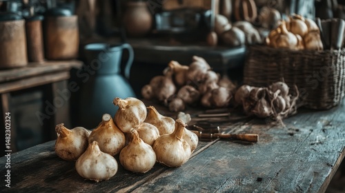 garlic, rustic, kitchen, wood, table, culinary, food, bulb, vegetable, natural, organic, fresh, cooking, basket, farmhouse, still life, vintage, warm, ingredient, home, interior, traditional, spice, favor, ingredient, decor, herbal, preparation, earthy, cosy, vegetarian, produce, root, closeup, scene, tabletop, harvest, healthy