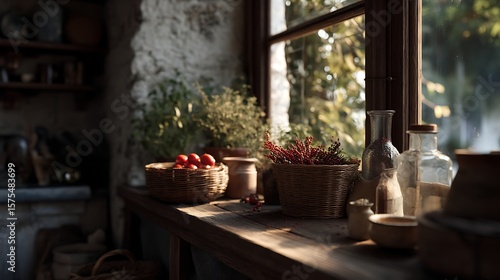 kitchen, window, rustic, tomatoes, herb, plant, basket, sunlight, bottle, glasses, jar, pottery, earthenware, shelf, window sill, interior, home, decor, country, style, vintage, antique, light, shadow, wood, stone, wall, cupboard, utensil, cooking, food, ingredient, organic, natural, fresh, produce, garden, homegrown, rural, countryside, farmhouse, bungalow, traditional, old, aged, weathered, textured, detail, decoration