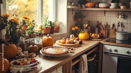Rustic kitchen with a pumpkin pie and baking ingredients on a wooden table, illuminated by warm light. Generative AI