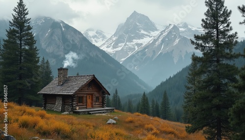 Rustic log cabin in mountains with smoke from chimney. Wooden house among pine trees, yellow grass on hillside. Snowy peaks in misty background. Peaceful secluded retreat in wilderness. Autumn