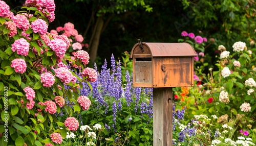 Rustic mailbox in a vibrant flower garden