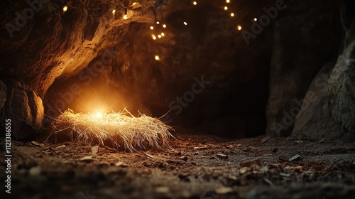 Rustic manger inside a dim cave, holy light illuminating, soft bokeh creating a spiritual Christmas ambiance