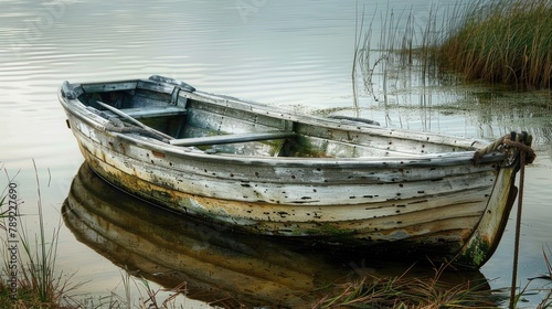Rustic Old Rowboat on the Water's Edge. Wooden Fishing Dinghy with Rudder in Lake. Nautical Vessel on a Peaceful Sea