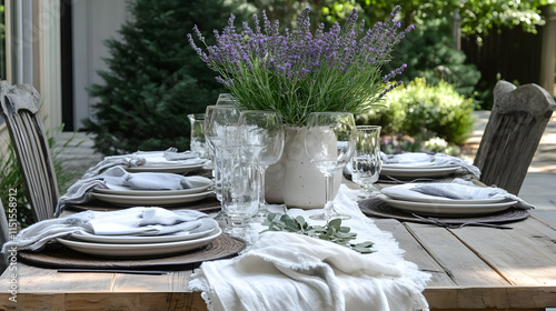 table setting, lavandula, wooden table, place setting, floral arrangement, summer, relaxing