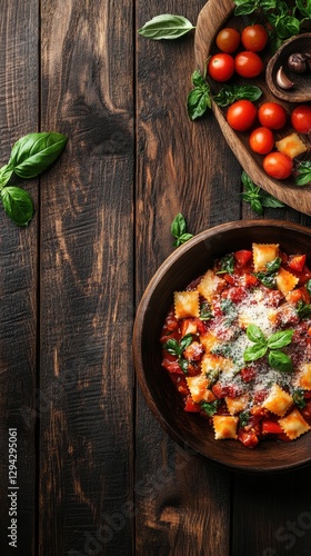 Rustic Ravioli Delight with Fresh Basil and Cherry Tomatoes on Dark Wood Table Italian Cuisine
