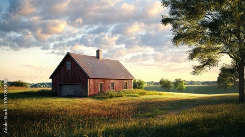 barn, red, farm, countryside, rural, landscape, grass, field, tree, sky, cloud, sunset, gold, hours, horizon, meadow, nature, scenery, outdoors, calmness, peace, rustic, wooden, old, vintage, farmhouse, building, green, pasture, farmland, agriculture, hay, foliage, summer, light, warm, house, structure, path, trail