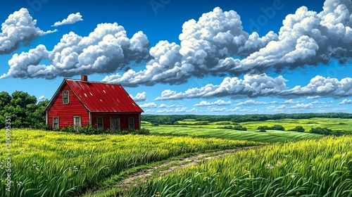 farmhouse, red, house, rural, landscape, field, yellow, green, sky, cloud, blue, summer, sun, bright, day, countryside, nature, scene, picturesque, idylli, serene, calm, peaceful, tranquil, beautiful, vibrant, colours, cheerful, joyful, happy, farm, agriculture, land, horizon, distant, tree, path, road, foliage, meadow, pasture, grain, crop, plant, vegetation