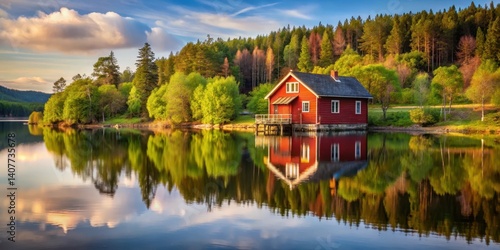 Rustic Red House Overlooking Serene Lake Scene , reflection, tranquil, reflection, tranquil, house, lake, landscape, wooden, peaceful
