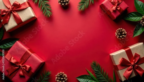 Rustic red surface, wrapped gifts, festive decor, copy space above, christmas background, top view, branches