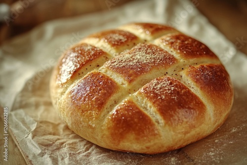 Rustic round bread, kitchen setting, baked, golden crust, wood background, food photography