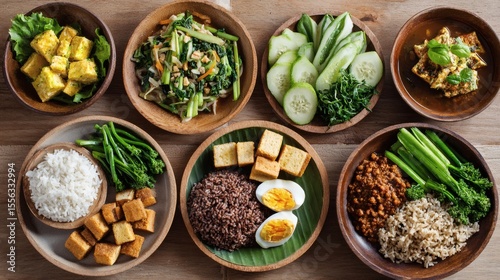 Rustic serving of traditional Indonesian vegetables and tempeh in assorted wooden bowls Image 4K UHD